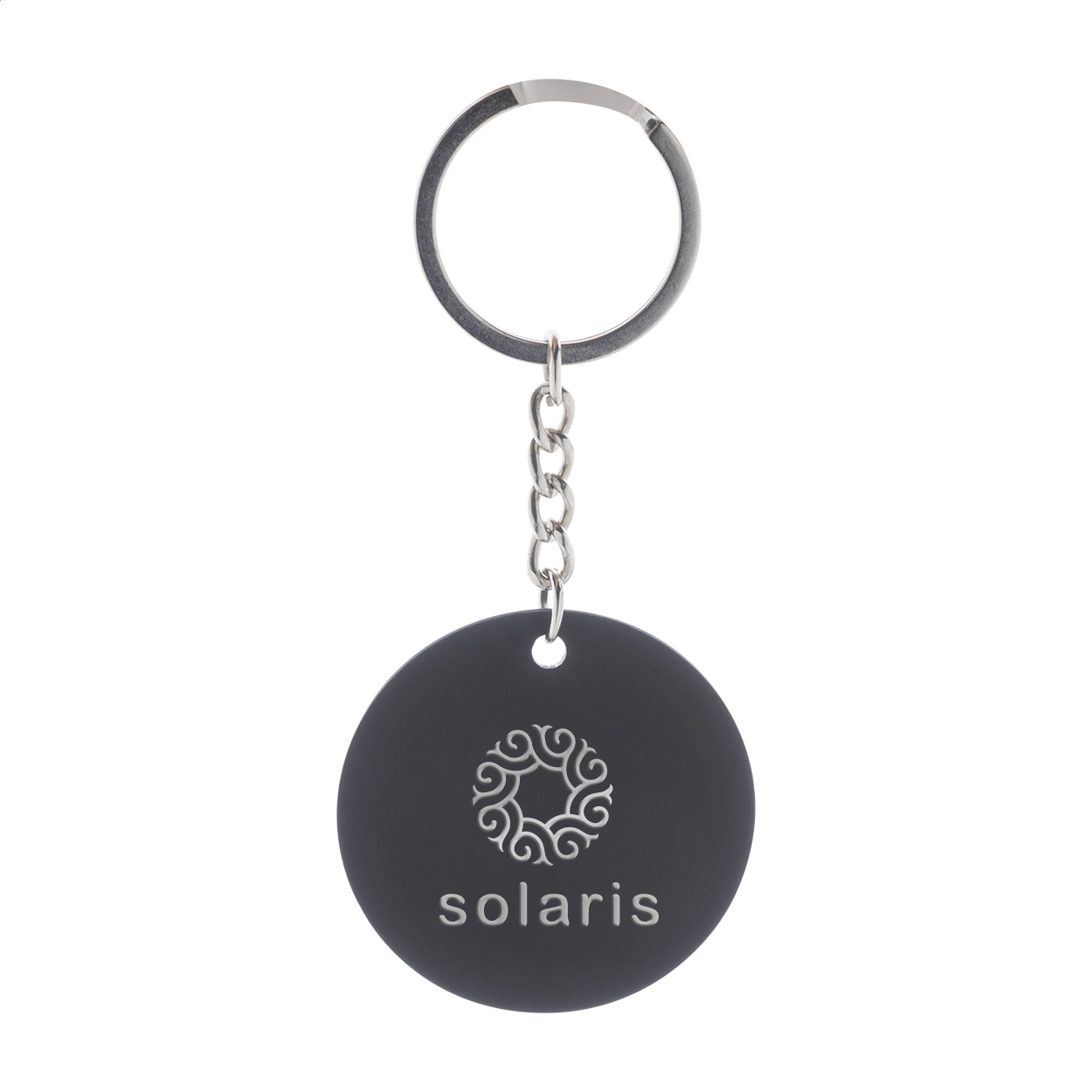Round shaped, recycled stainless steel keyring with rubberized finish. With special coating for mirror laser engraving.