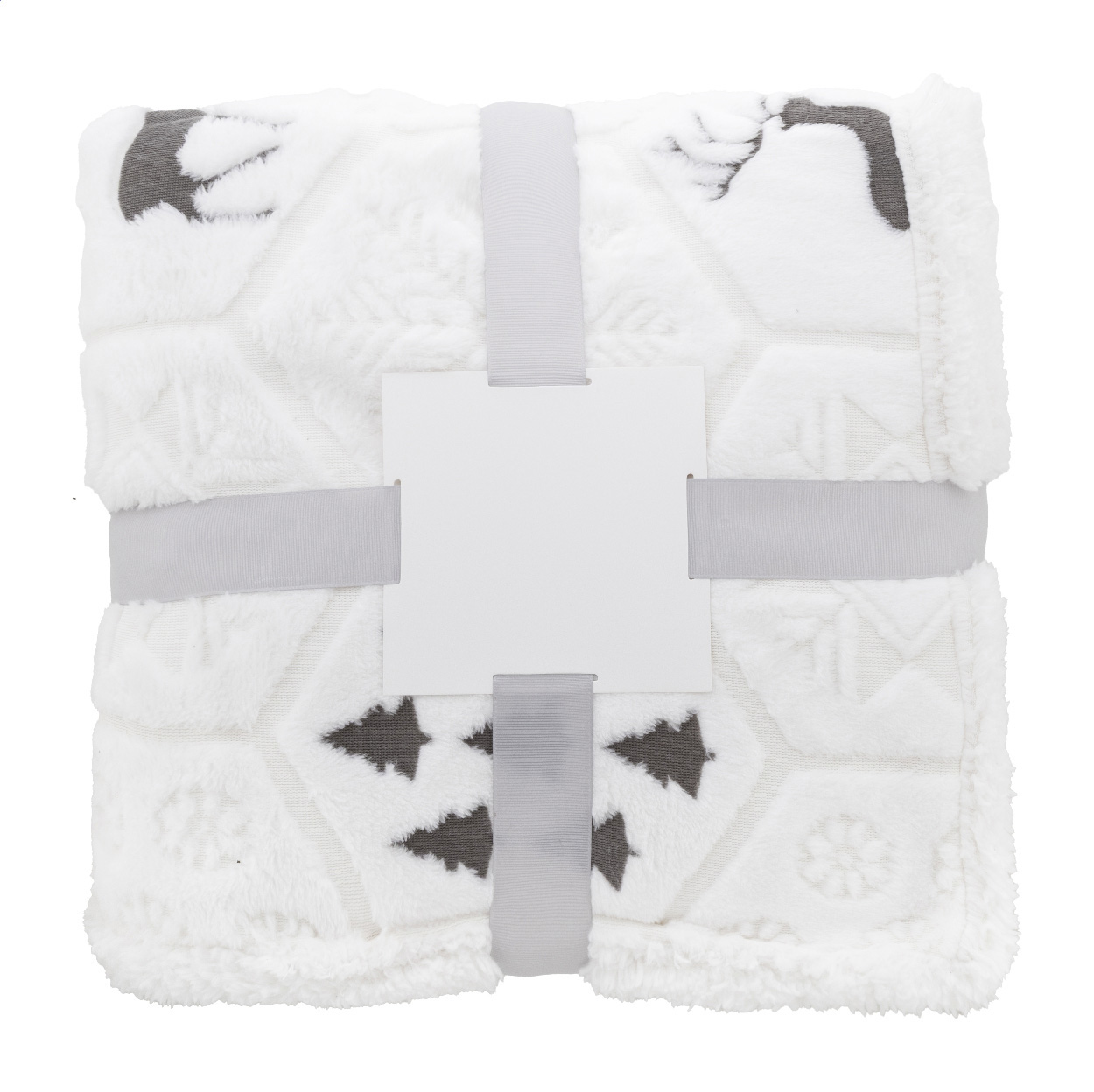 Luxury dual-layer RPET Christmas blanket with embossed winter theme pattern. With 270 g/m² RPET flannel fleece and reversible 210 g/m² RPET sherpa fleece lining. Wrapped in ribbon and printable paper card.