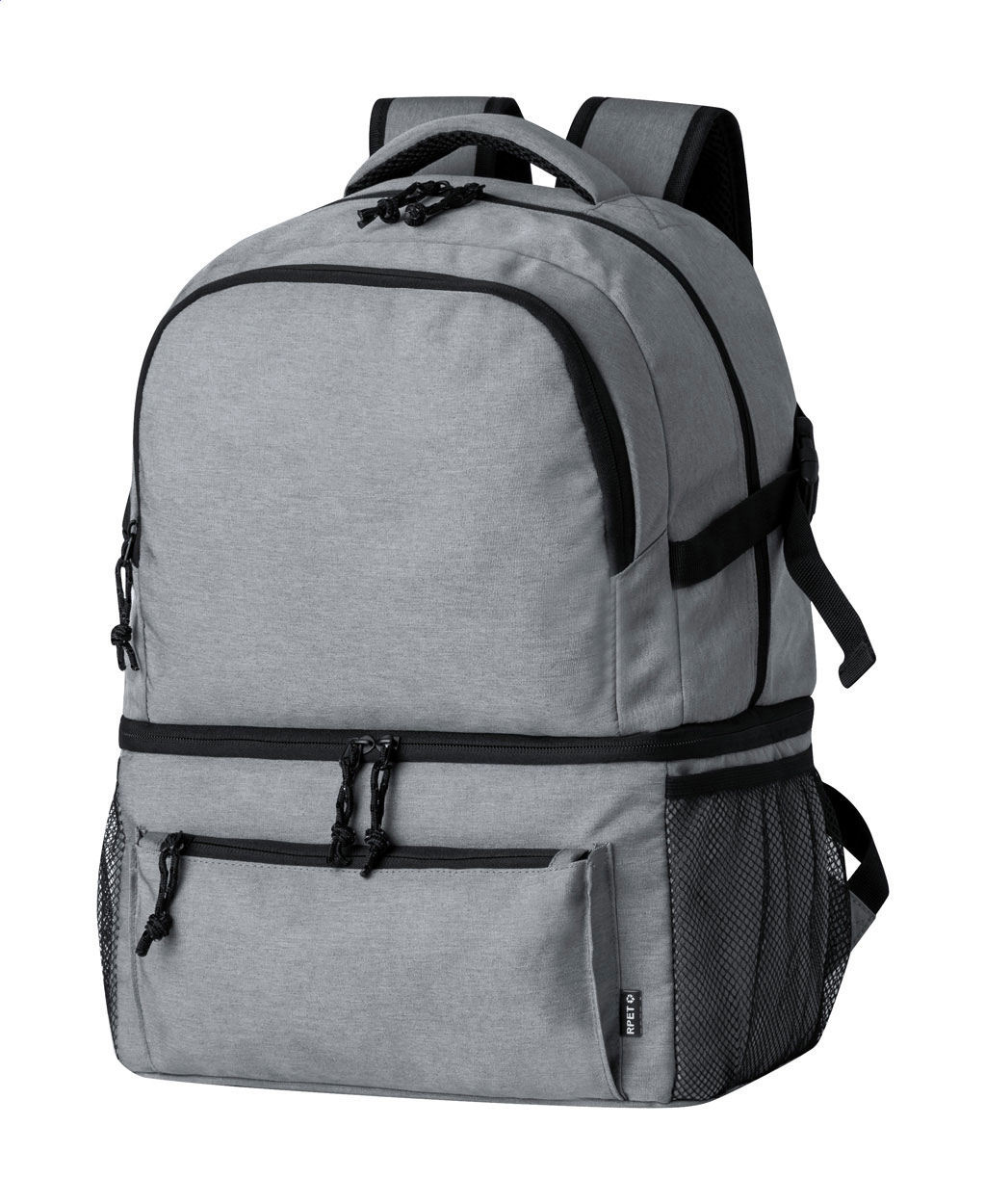 RPET backpack with PEVA padded cooler compartment, zipped pockets, mesh side pockets, padded back and shoulder straps. 600D RPET polyester, with distinctive RPET label.