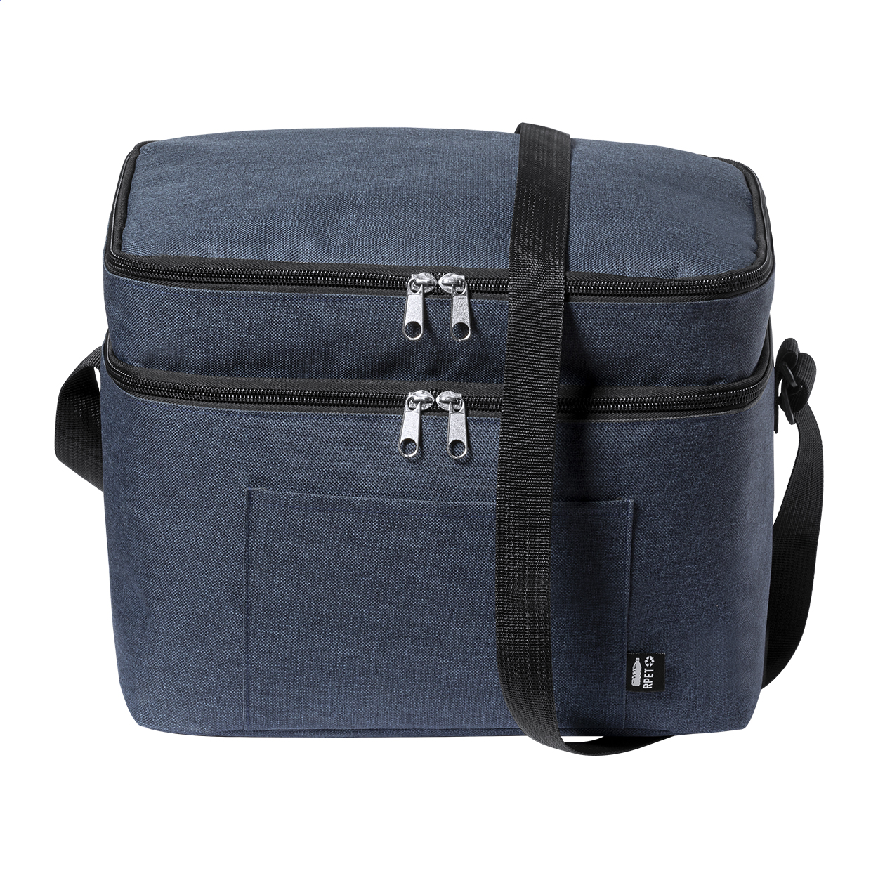 600D RPET polyester cooler bag with PEVA padding, with 2 zipped compartment and adjustable shoulder strap. With distinctive RPET label.